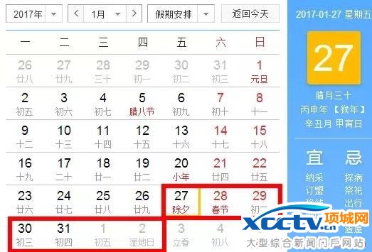 2017年1月27日至2017年2月2日调休,放假7天