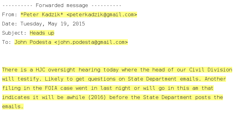 2015 年 5 月,美国司法部在对希拉里“电邮违规”问题展开调查的同时,彼得·卡得泽克在写给希拉里团队负责人的标题为“注意了”的邮件中是这样说的:“今天众议院司法委员会有一个听证会,民事部(Civil Division) 的负责人会去作证。很可能会问到美国国务院电邮违规的事情。”