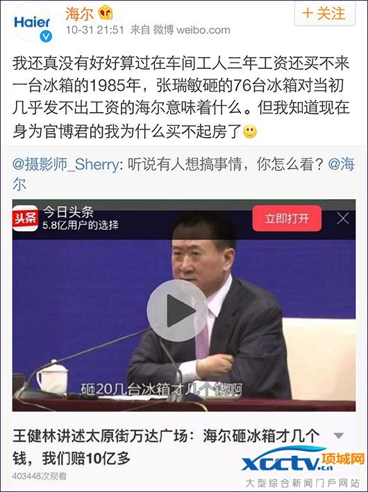 王健林“口出狂言”,海尔不服了,其官博在10月31日称:“我还真没有好好算过在车间工人三年工资还买不来一台冰箱的1985年,张瑞敏砸的76台冰箱对当初几乎发不出工资的海尔意味着什么。但我知道现在身为官博君的我为什么买不起房了。”