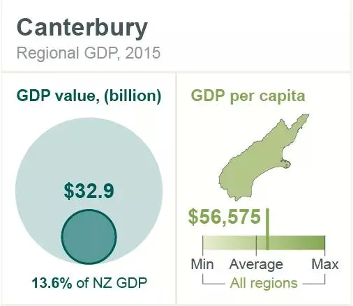 经过几年的灾后恢复,坎特伯雷地区的经济得到了很好的发展。 每经小编(微信号:nbdnews)通过查询新西兰统计部门数据发现,从2010年——2015年,坎特伯雷地区的GDP增长了37.2%,达到了329亿美元,增速在15个地区中排名第一。2015年,整个新西兰的GDP为2412亿美元。因此,坎特伯雷地区2015年的GDP占全国的13.6%,该比例仅次于奥克兰。