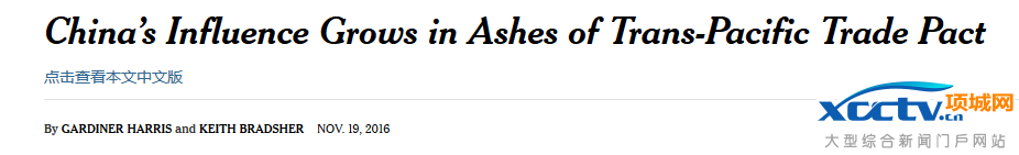 纽约时报标题:TPP搁浅成定局,中国影响力渐涨,纽约时报中文网站直接译为“中国成最大赢家”。