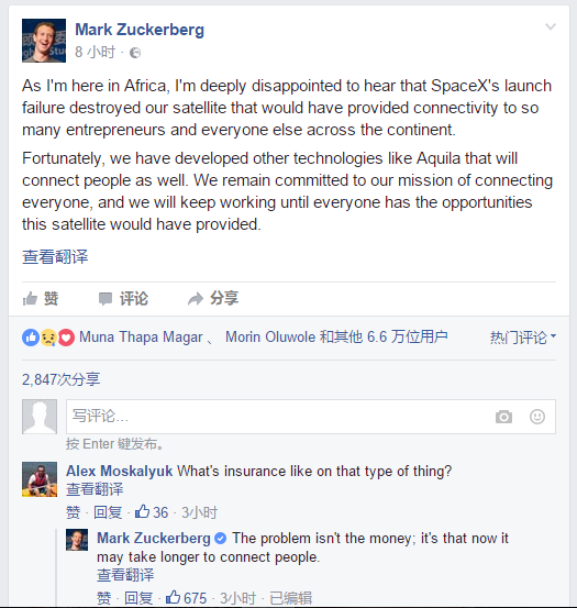 此时正在非洲尼日利亚考察的Facebook创始人兼CEO扎克伯格听到爆炸的消息后,第一时间在Facebook上表示“极度失望”。因为这次运载的Amos 6卫星是Facebook与法国欧洲通讯卫星公司(Eutelsat Communications)联合开发的。