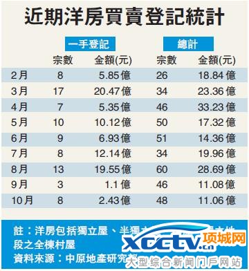 一手方面,10月份一手洋房买卖合约登记录得8宗及总值2.43亿元,按月分别升1.7倍及1.2倍。虽然一手洋房交投回升,但黄良昇称,洋房新盘买卖仍然偏低。