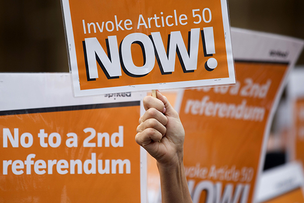 9月5日,在英国首都伦敦议会大楼外,“脱欧”支持者手举标语呼吁启动《里斯本条约》第50条,正式开始“脱欧”程序。