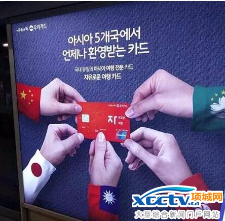 韩国“NEWS1”网站8日报道称,该国友利银行信用卡广告因将中国台湾、香港和澳门三个地区称作“国家”引发巨大争议。在投放于首尔地铁站的广告中,五只手共同拿着一张红色的友利银行信用卡,袖管分别为中国、日本的国旗,中国香港特区、澳门特区的区旗,以及中国台湾地区的“青天白日旗”。该广告词写道:“受亚洲五个国家欢迎的信用卡”。