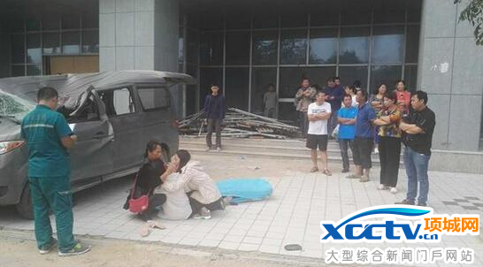 现场看到面包车的车顶凹进车身,驾驶室也被严重挤压变形,前挡风玻璃碎裂。伤者的亲属是泣不成声。坠楼者后来被转入ICU进行急救,暂时具体情况不明。