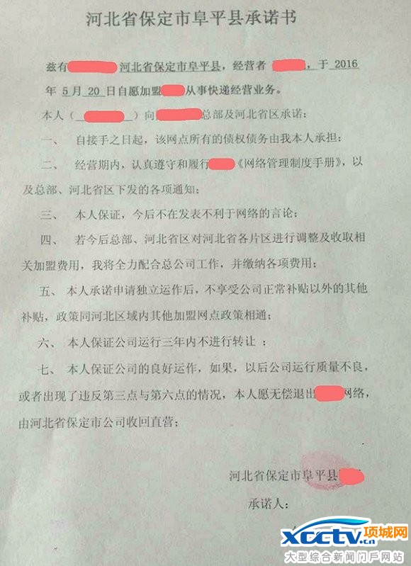 对于这样的处罚,被加盟协议绑架加盟商只能逆来顺受——怎么罚、罚多少完全由总部制定,并无任何监管部门。记者在一份某快递企业加盟商的承诺书中看到,加盟者必须承诺:“若今后总部对各片区进行调整及收取相关加盟费用,我将全力配合总公司工作,并缴纳各项费用”,并且保证:“今后不在发表不利于网络的言论”,如果违反这一条,“本人愿无偿退出,由市公司收回直营”,所以加盟商们是敢怒不敢言。