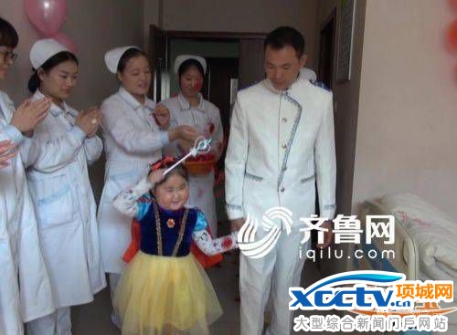 他的父亲史新站说:“如果父母看不到女儿出嫁的场景,还能有什么比这更遗憾呢?” 终于,在医院护士们的帮助下,6岁的小女孩穿上了最喜欢的公主泡泡裙,与父亲史新站手拉手,伴随着婚礼进行曲走进病房,美丽的“小海青”公主嫁给了她的“白马王子”。