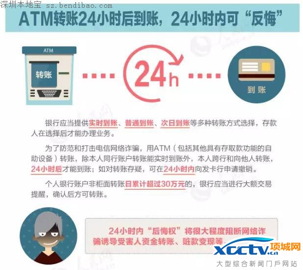 【导语】:12月1日起,银行正式施行转账新规,客户在ATM机进行转账操作时,除同行同户名的卡,其他均在24小时后到账,且在24小时之内,都可以通过银行柜台申请撤销转账。银行转账新规刚实行,就有新骗局出现!一定要注意哦!
