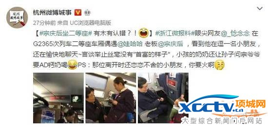 12月22日,据媒体,今天有网友微博上爆料:在动车G2365次上偶遇宗庆后。眼尖的网友还指出,“宗庆后坐的好像是二等座啊!还会逗身边的小朋友开心呢,一点也没有首富的架子。小朋友的奶奶还让小朋友问宗爷爷要AD钙奶喝,也是幽默哈哈哈!”相关工作人员称:“这是真的,今天早上杭州东去义乌的高铁上。一等座车票不足,老宗就说和大家一起做二等座了。”