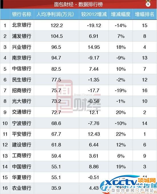 下图是面包财经(微信公众号:mbcaijing)根据财报统计的2015年上市银行人均净利润排行榜:
