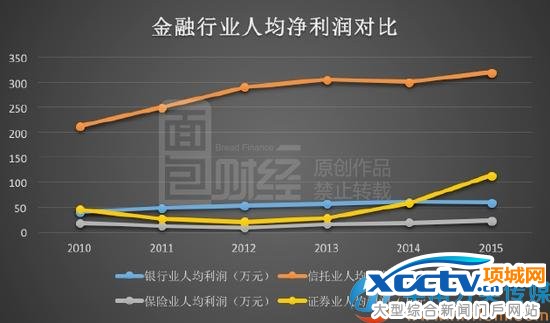 虽然同属于银监会监管的金融机构,信托公司的人均赚钱 能力远胜银行业。中国信托业协会的数据显示:2015年信托行业人均净利润高达319.91万。根据面包财经的测算,这一水平分别相当于去年A股上市券 商、银行和保险公司的2.82倍、5.45倍和14.38倍。下图是面包财经(微信公众号ID:mbcaijing)绘制的各类金融机构近年来人均净利润 对比图: