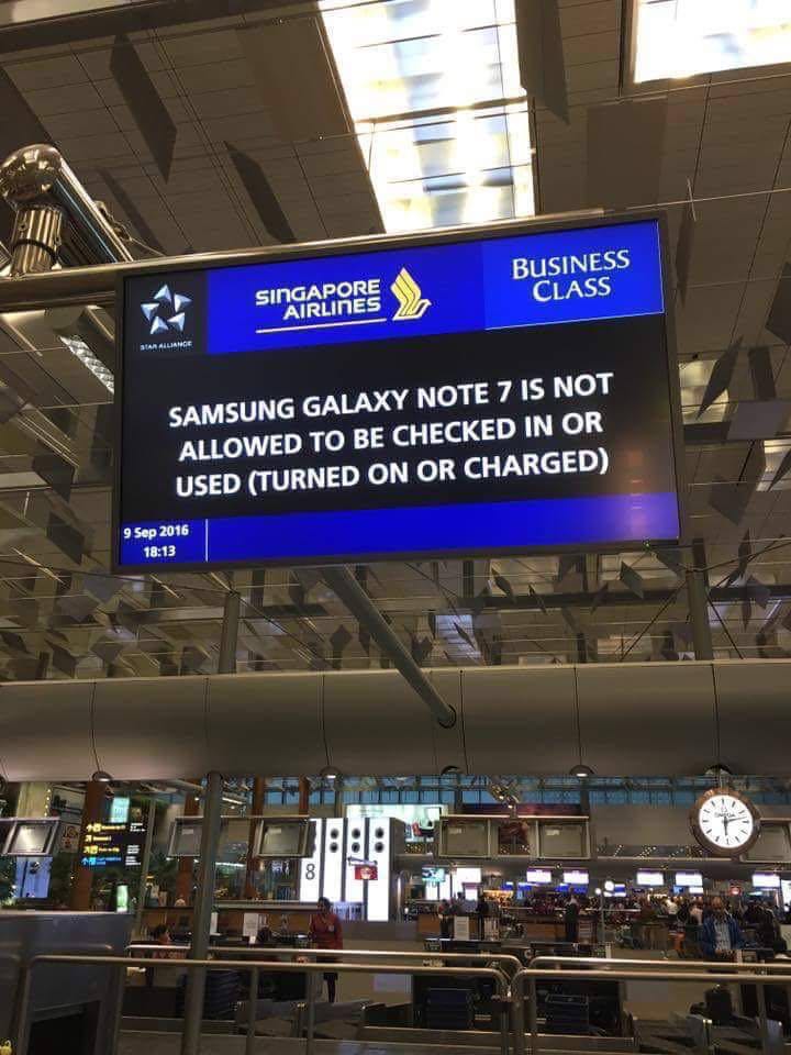 估计三星这几天都在各个机场公关,因为陆续有机场禁止三星的Galaxy Note 7带上飞机,就像下图的新加坡机场一样。