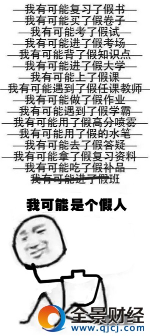 有的考生以这样的句式来调侃自己考试成绩不理想,衍生出了“我可能复习了假书”“我可能拿到了假试卷”“老师可能划了假重点”等句子,配上苦恼的表情包,迅速在大学生群体中传播开,让该句式快速传遍朋友圈和微博。之后,这句话更是直接演变成了“我可能是个假人”,让“我可能是假的”成为流行语。