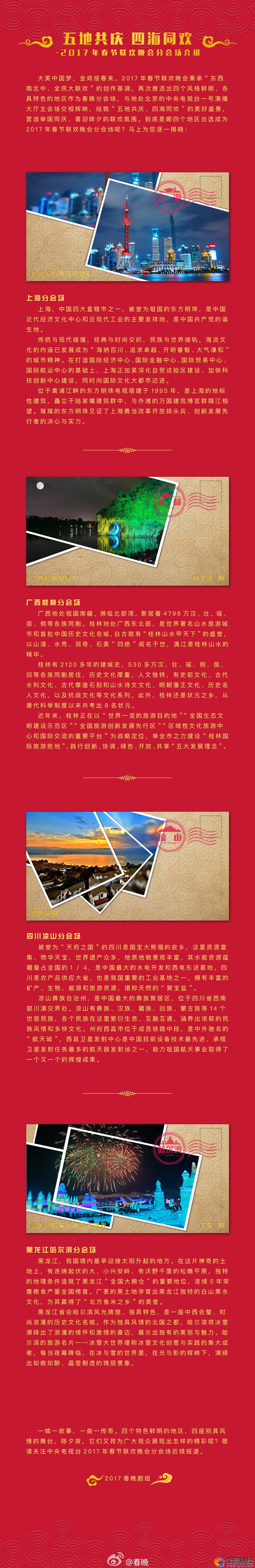 2017央视春晚四大分会场地点:上海、广西桂林、四川凉山、黑龙江哈尔滨【查看详情】