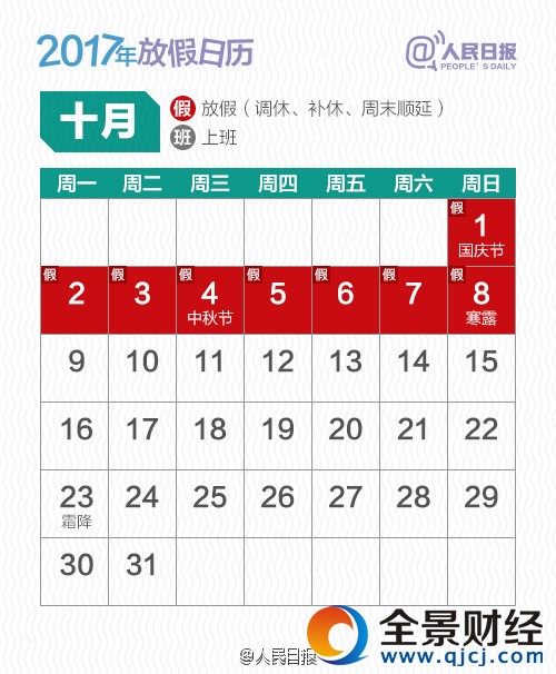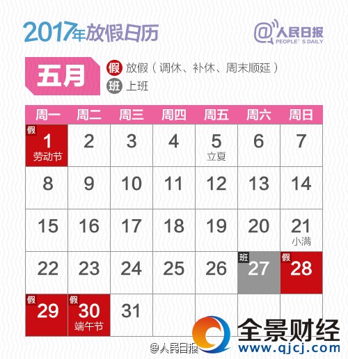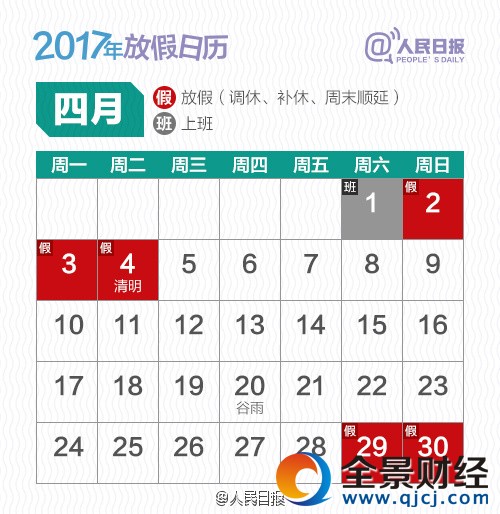 】春节假期刚结束,你已经开始期待下个假期了?算上周末,2017年还有102天假期!①清明:4月2-4日,1日上班;②劳动节:4月29日-5月1日;③端午:5月28日-30日放假,27日上班;④中秋节、国庆节:10月1日-8日放假,9月30日上班。计划提前安排起来?转!