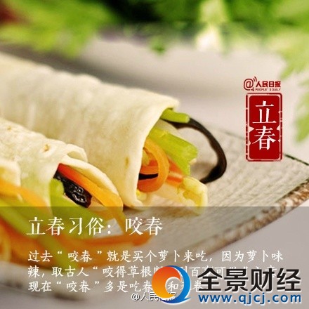 立春时民间有“咬春”的习俗,立春吃春饼,是人们对“一年之计在于春”的美好祝福;而“咬春”嚼萝卜,则取古人“咬得草根断,则百事可做”之意。一个咬字,是心情,更是心底埋下的吃得了苦的一种韧劲儿。