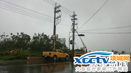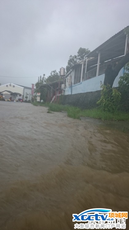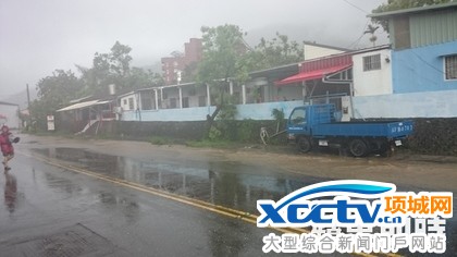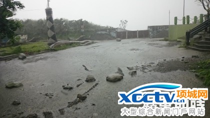 知本积水路面成小河,住户拾吹落屋顶铁片。刘人玮摄