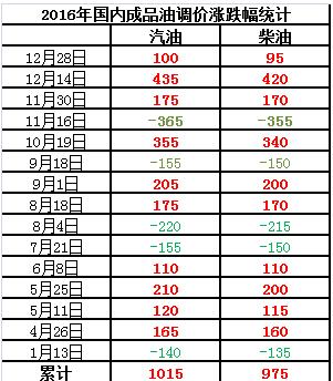 12月28日17时,国家发改委网站宣布,自2016年12月28日24时起,国内汽油价格上调100元/吨、柴油价格上调95元/吨。折合92号/93号汽油和0号柴油每升上涨0.08元,以50升汽车油箱的标准测算,加满一箱油多花4元。