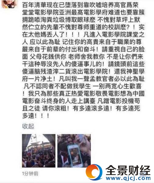2月11日,“娱乐圈的搬运工人”在微博发出一张名自称是“孟教官”的北电老师朋友圈截图,截图中的内容显示这位老师对于在考场发生的拥堵非常不满,将配图中的现场评价为“堂堂电影学院亚洲最高学府难道也要靠簇拥跪舔掏粪垃圾博取眼球么”。还表示要“请镜头前这些傻逼脑残渣滓二货滚出电影学院!”字里行间不乏激烈的言辞。