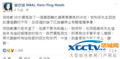 梁士华也在脸书回应「有时候放手看着对方去更好的地方,也是另外一种相爱的方式」。她10月出席活动时,还透露将会是森林系和嬉皮风的婚礼,没想到婚事停摆,对此表示「很抱歉让大家失望了,但请不要为我担心,我很好,也很感谢梁先生这些年为这段感情做的努力,我们还是朋友,即便无法手牵手走入婚姻,再次谢谢所有给我爱的朋友和你们,今后,我会更努力在工作上,谢谢」。梁士华也在脸书向旧爱喊话「我会很好,不会输给你的」。他说这样的决定很艰难,很痛苦,谢谢这些年谢欣颖的陪伴,「故事不一定都是完美的结局,有时候放手看着对方去更好的地方,也是另外一种相爱的方式」,称相爱的日子很快乐,「谢谢你为我做过的一切努力」。