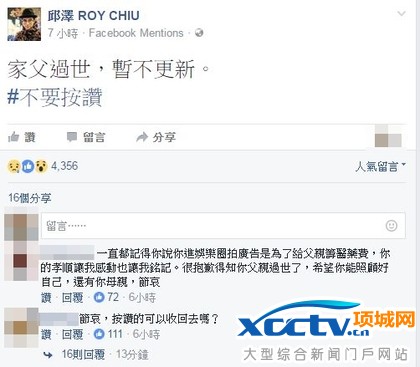 邱泽请网友不要对噩耗按讚。翻摄邱泽脸书