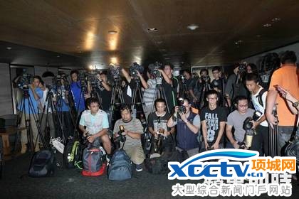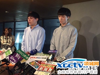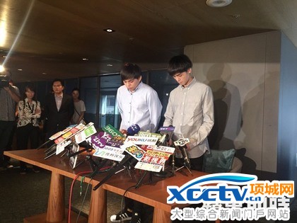 胡睿儿(右)和杨琳现身记者会,鞠躬道歉。赵世平摄