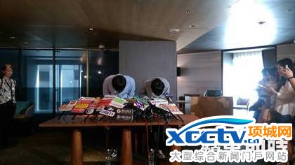 胡睿儿(右)和杨琳现身记者会,一出场就鞠躬道歉。赵世平摄