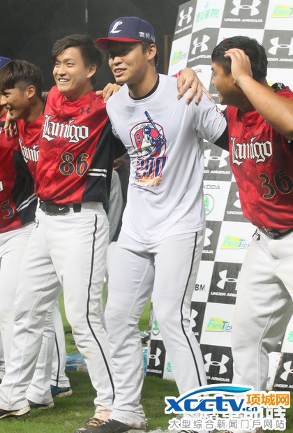 王柏融赛后与队友跳舞同乐。游智胜摄
