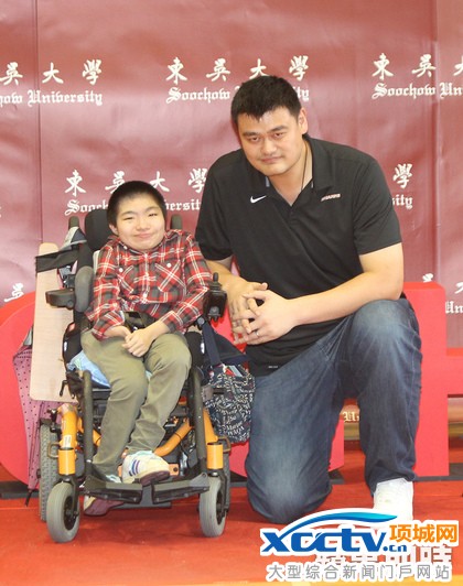 姚明和患病行动不便的学生球迷合影。陈俊杰摄