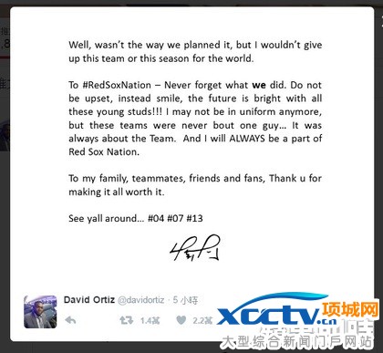 红袜遭到印地安人横扫,也让球迷无法多看到几场宣布今年球季后退休的「老爹」欧提兹(David Ortiz)场上英姿,而老爹今天在个人推特上贴上了一封公开信,向球迷道别,信中也写着:「我将永远是红袜的一份子。」老爹简短信函全文翻译如下:「好吧,这不是我们原本所计画的,但我永远不会忘记这支球队或这个球季。给所有红袜的一份子,永远不要忘记我们所做的事情,不要失望,而是要微笑以对,有这群年轻球员在,未来是光明的。我可能永远不会在穿上球衣,但球队并非永远只靠一个人就可成事,永远都是要靠团队力量。而我,将永远会是红袜的一份子。给我的家人、队友、朋友与球迷,谢谢你们让的职业生涯更有意义。再见了...#04 #07 #13。」老爹文末最后的3个数字,所代表的意义是他在红袜期间,帮助球队夺得世界大赛冠军的3个年份,他大联盟生涯20年,平均打击率2成86、541发全垒打、1768分打点,生涯全垒打史上排行第17。(赖德刚/综合报导)