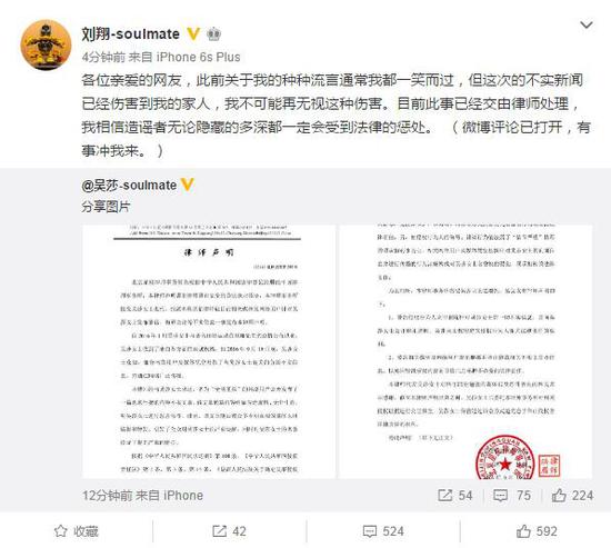 刘翔在微博说道:各位亲爱的网友,此前关于我的种种流言通常我都一笑而过,但这次的不实新闻已经伤害到我的家人,我不可能再无视这种伤害。目前此事已经交由律师处理,我相信造谣者无论隐藏的多深都一定会受到法律的惩处。(微博评论已打开,有事冲我来。)