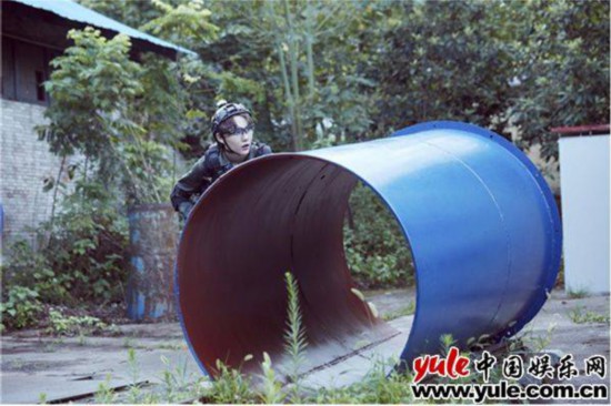李权哲小心翼翼地躲在圆形钢材后,正一脸警惕地观察前方环境。