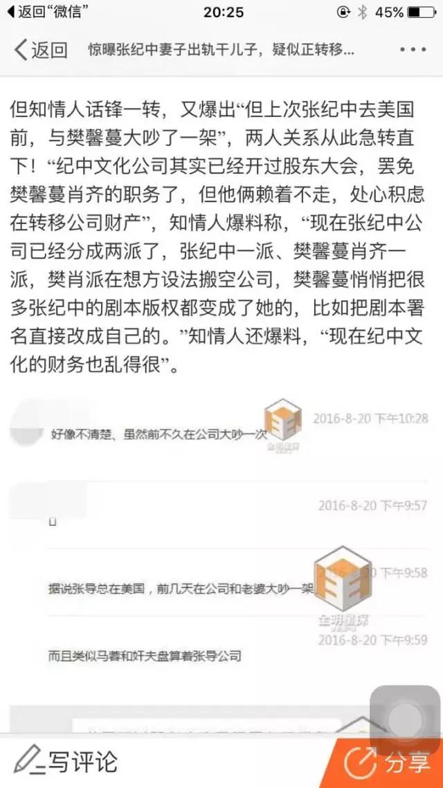 8月30日下午,全民星探援引圈内知情人士爆料称张纪中妻子,著名电视导演樊馨蔓出轨干儿子肖齐,并正在设法转移纪中文化资产。知情人士表示张纪中在去美国前与樊馨蔓大吵了一架,两人关系从此急转直下,以及转移财产的诸多细节。