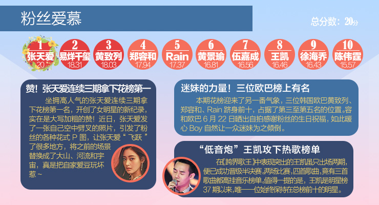 另外可以发现,凯凯王人气一直相当稳定。在《跨界歌王》中表现突出的王凯虽只出场两期,便已成功晋级半决赛。两场比赛,四首歌曲,竟有三首歌曲都高挂音乐榜单,羡煞了音乐圈内圈外的一众人士。值得一提的是,王凯不仅是花榜的常客,更是明星榜37期以来,唯一一位始终保持在总榜前十的明星。