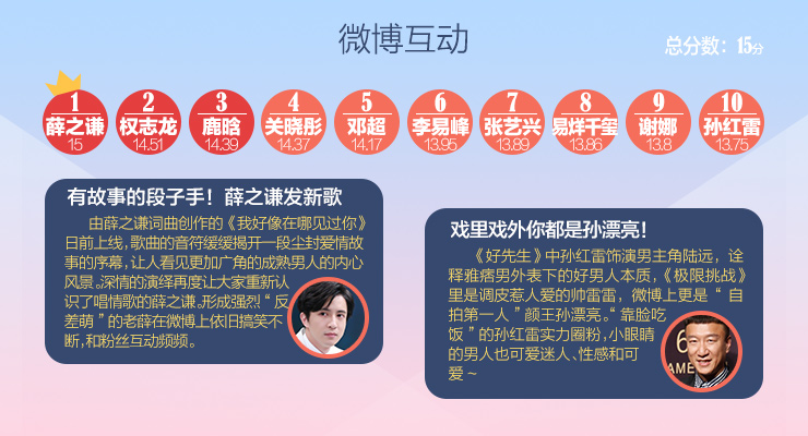 微博互动方面,本期第一被薛之谦收入囊中,而孙红雷的入榜也成为新的关注点。日前,由薛之谦词曲创作的《我好像在哪见过你》上线,歌曲的音符缓缓揭开一段尘封爱情故事的序幕,让人看见更加广角的成熟男人的内心风景。深情的演绎再度让大家重新认识了唱情歌的薛之谦。形成强烈“反差萌”的老薛在微博上依旧搞笑不断,和粉丝互动频频。