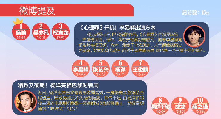 最后来看微博提及。本期鹿晗摘得分榜冠军。前阵子,由鹿晗担纲男主角的《择天记》在上海召开发布会,当天,在《择天记》发布会结束的媒体群访环节,由于鹿晗是第一次去横店拍戏,又是盛夏最热的时节,有媒体问他有准备什么避暑装备。而鹿晗回答是:“带了很多防蚊的,还有电脑!”表示因为集中注意力玩电脑,所以不觉得热,可以避暑。短短的采访让不少人被呆萌的傻狍子逗乐了。