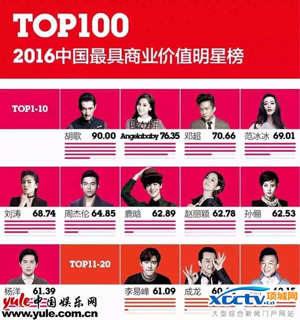今年的榜单中,排名前10位的明星依次为胡歌、Angelababy、邓超、范冰冰、刘涛、周杰伦、鹿晗、赵丽颖、孙俪、杨洋。而据该杂志总榜单及多项分榜单综合显示,鹿晗是将品牌关注度转为成功合作转化率最高的明星。